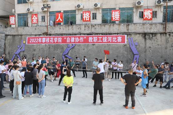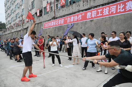 2022年9月30日15时,学校排球场横幅高挂,赛程张榜,各路参赛队伍齐聚于此,一时间人声鼎沸、热火朝天。由校工会主办、体育部承办的攀枝花学院“自律协作”教职工拔河比赛如期举行。来自全校各二级分工会(支部)组成的20支代表逾400名选手即将展开紧张激烈的拔河比拼。